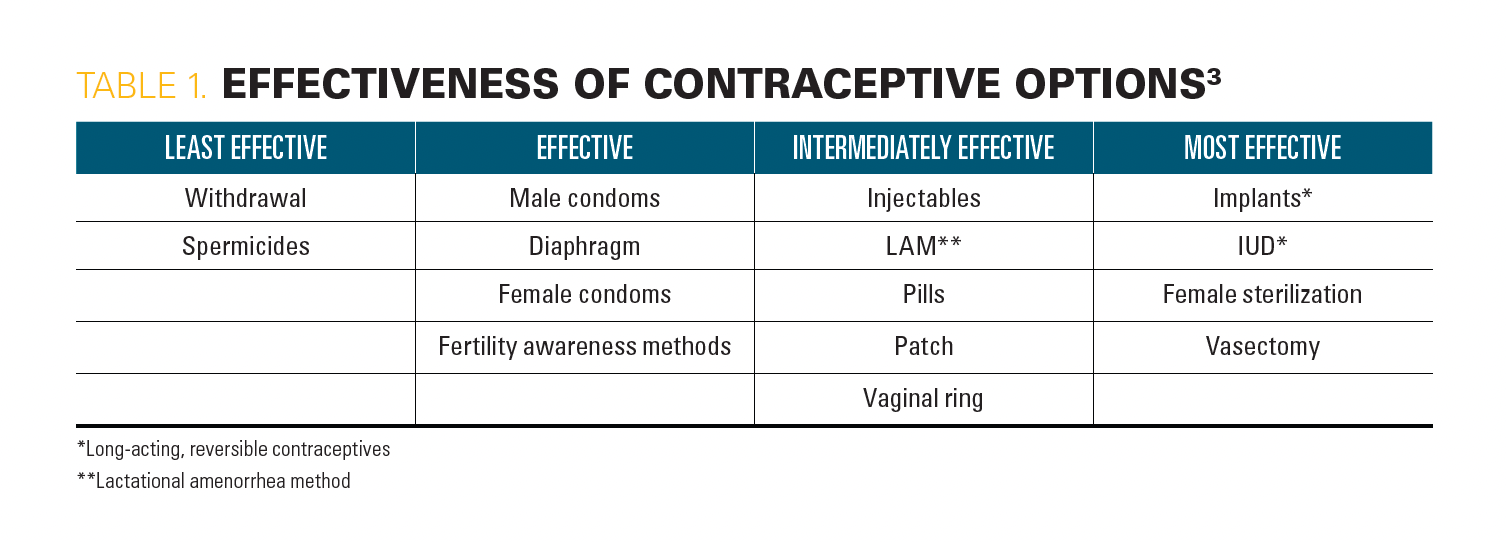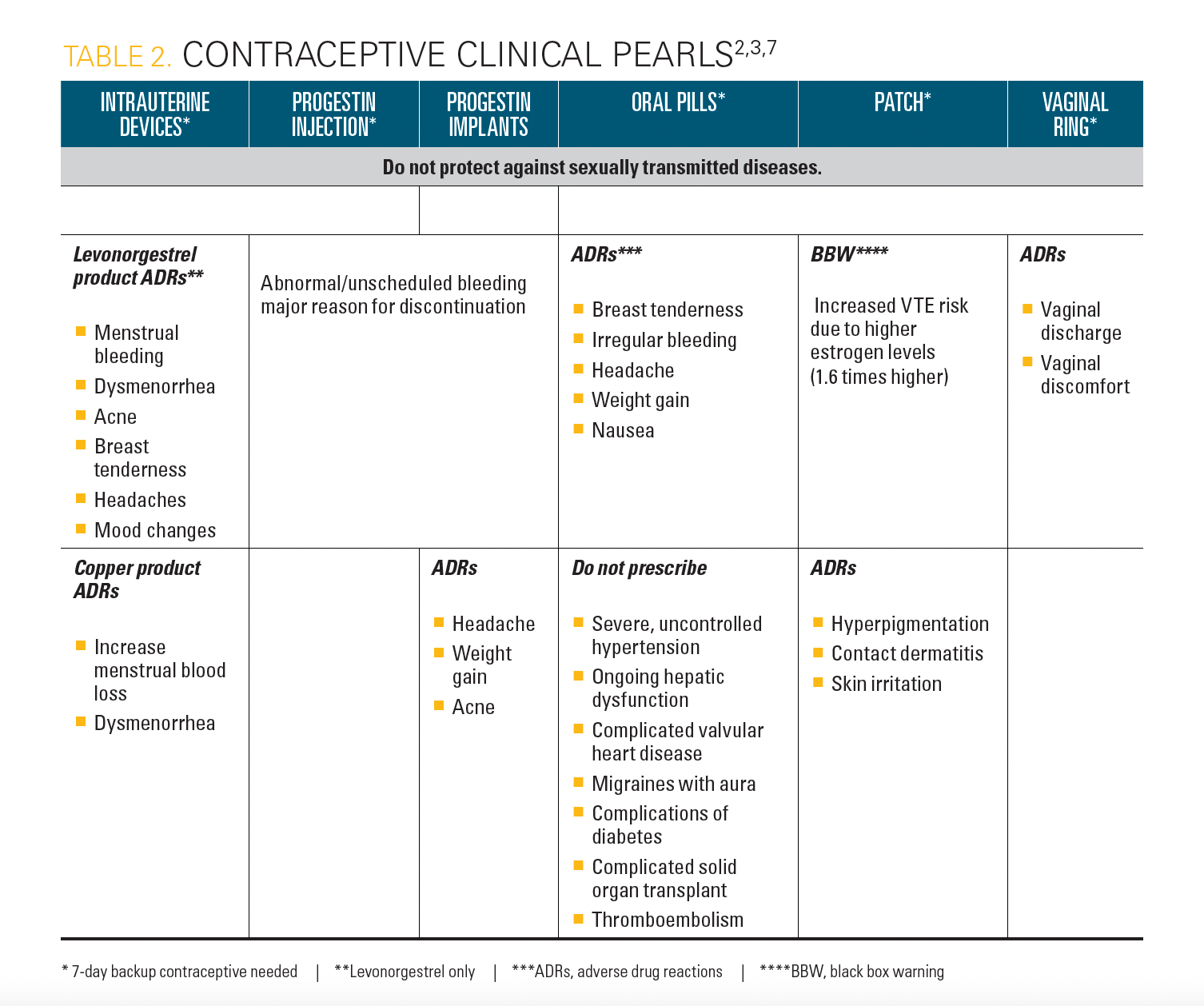 Various methods of contraception are available for adolescents3 (Table 22,3,7). Medical providers should counsel them on the efficacy, safety, and adverse effects of contraception,1 informing them about the most effective options. Contraceptive options from most effective to least effective are as follows: intrauterine devices/progestin implants, progestin injections, and combined oral contraception (pills, patch, vaginal ring).2 Regarding efficacy, discussing aspects of “typical” use and “perfect” use is also recommended. Perfect use is when a contraceptive is used correctly all the time, whereas typical use takes human error into account;1,2,3 this includes missing pills or forgetting to change a patch, as well as using a condom.1,2 Common adverse effects are listed in Table 2.