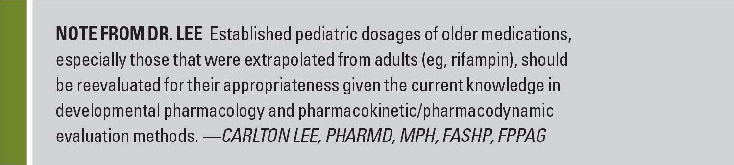 Dosage recommended for children was extrapolated from the adult dosage based on the assumption that the same dose per kg is appropriate across all ages. The limited pharmacokinetic information in children suggests that young children receiving adult-derived dosages have drug exposures significantly lower than adults.31,32 In fact, children receiving recommended standard dosages of 10 mg/kg demonstrated very low serum rifampin concentrations with a mean AUC of 18.1 mg/h/L at steady-state, which is about half of adult levels.33 These recommendations also are at least partly based on historical concerns of toxicity with higher rifampin doses and what was then a high cost associated with the manufacturing of the drug.34