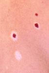 Halo nevi appear as one or more moles with sharply demarcated rings of depigmentation. The halo generally forms around an acquired intradermal nevus, but halos surrounding epidermal, junctional, congenital, and Spitz nevi also have been described.2,3 The onset of the ring of depigmentation is thought to occur over a period of days to weeks. The central pigmented lesion may persist or completely disappear. Repigmentation of the skin can occur over years.