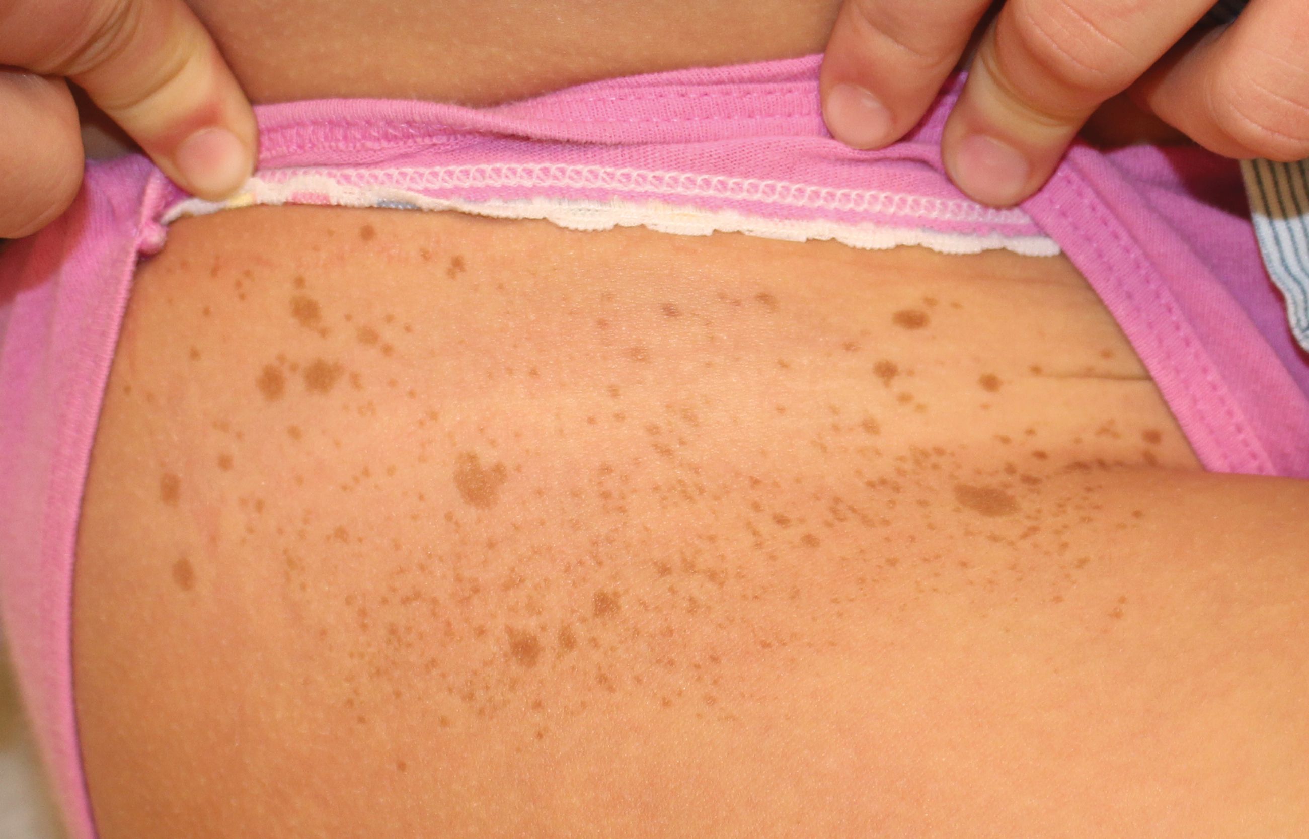 About 10% of the general population has 1 to 2 café-au-lait lesions, which can be normal.3 Other important differential diagnoses include syndromes associated with café-au-lait macules (NF2, legius syndrome, McCune Albright syndrome, and multiple familial café-au-lait), conditions associated with pigmented macules (Peutz-Jeghers syndrome, LEOPARD syndrome, neurocutaneous melanosis), and other conditions causing tumor or localized overgrowth (lipomatosis, fibromatoses, speckled lentiginous segmental eruption).3
