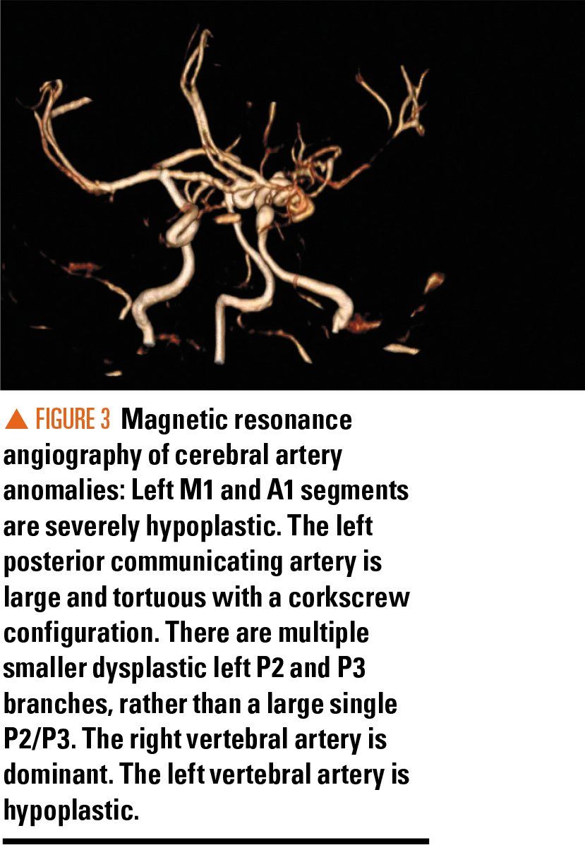 Patients with mid- to high-risk arterial anomalies require daily aspirin for ischemic stroke prophylaxis.7 Pediatric neurology can guide prophylaxis recommendations and provide close neurologic follow-up.