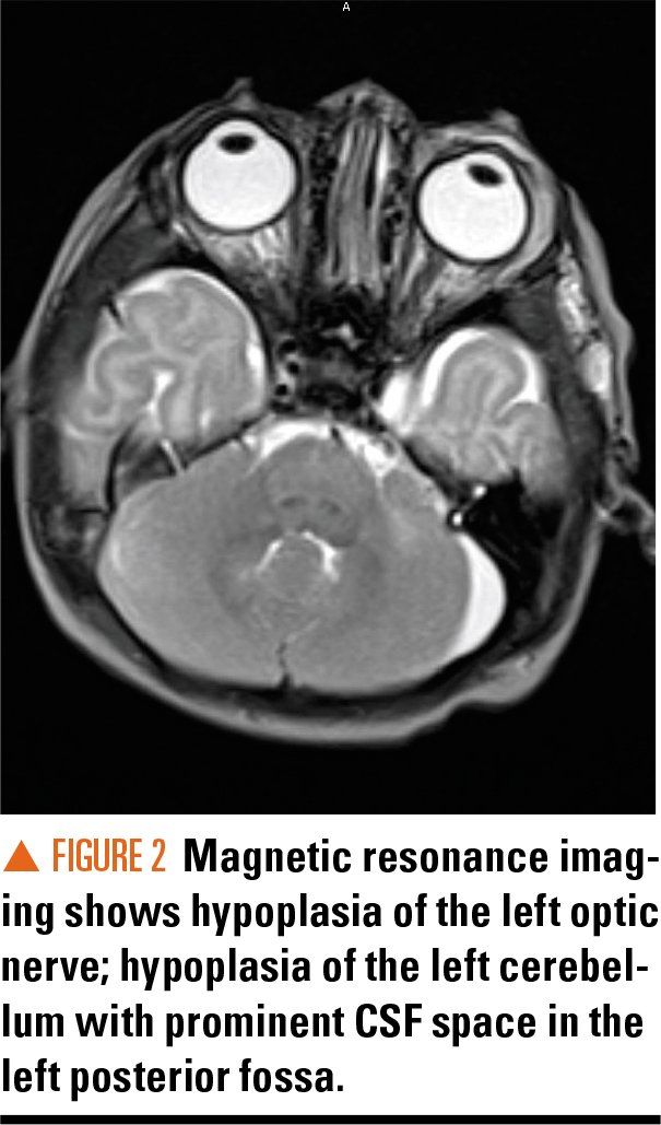 Parents of this particular patient reported normal development and denied seizures, cyanosis, or feeding concerns. An MRI of the head and neck confirmed temporal and intraorbital hemangioma with hypoplasia of the left optic nerve (Figure 2). Additionally, hypoplasia of the left cerebellum was noted as well as several dysplastic and hypoplastic intracranial arteries on the affected Dermatology, Ophthalmology, and Neurology were consulted to provide insight and guidance.