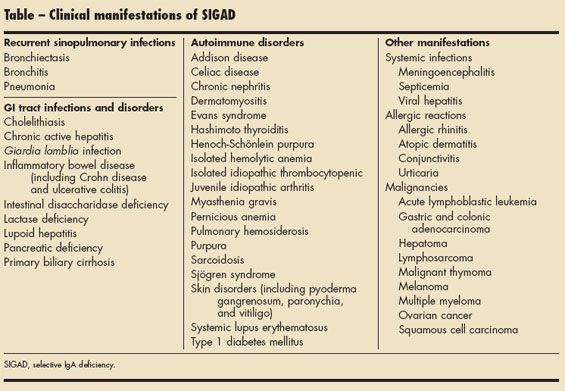 Although most persons with SIGAD are asymptomatic, some appear to be more susceptible to particular infections and autoimmune disorders. Up to one-third of patients with SIGAD have recurrent infections (such as recurrent otitis media and sinopulmonary and GI tract infections).1,13 The Table lists the conditions associated with SIGAD.