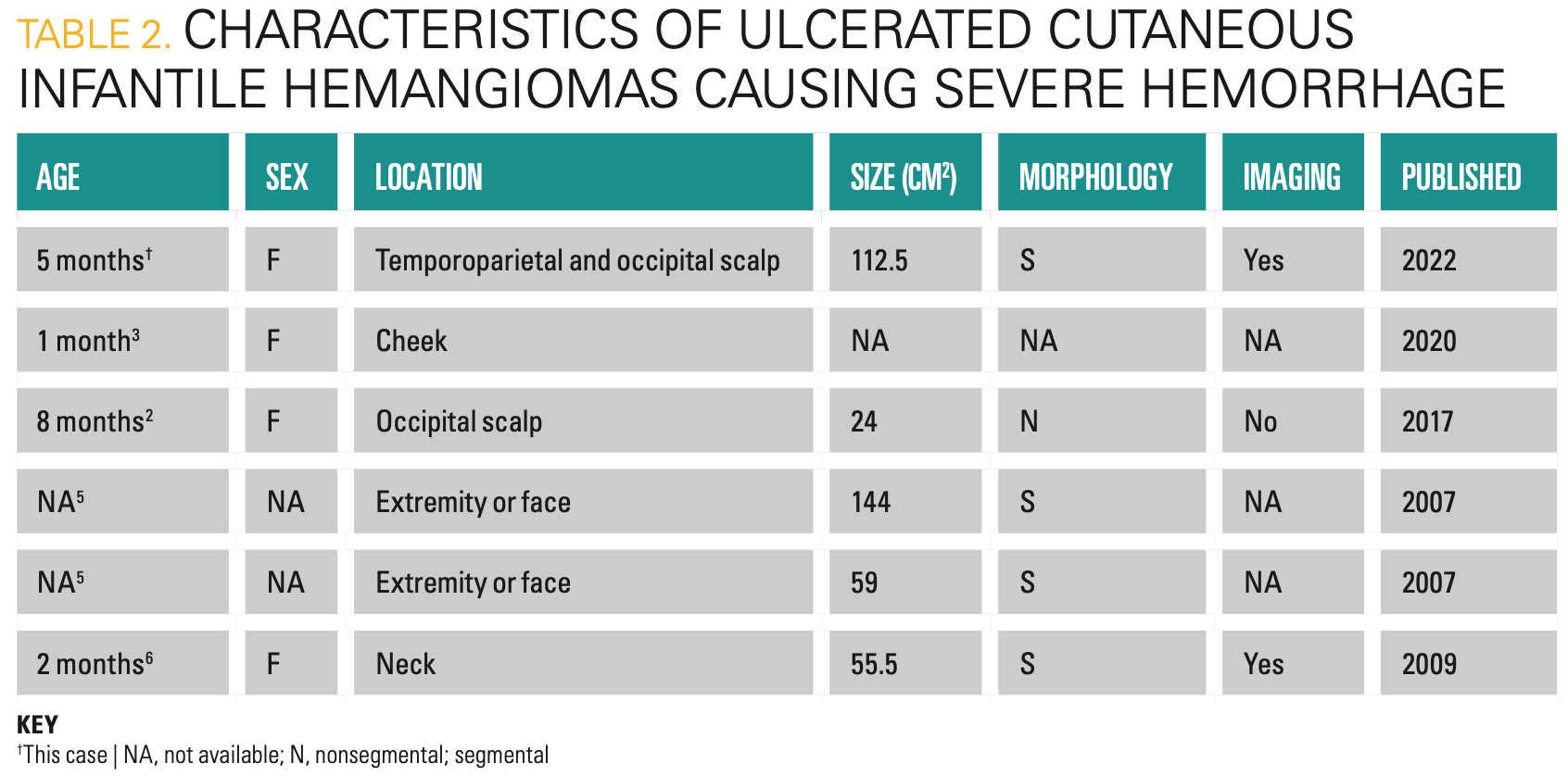 2. Charny JW, Moon AT, Treat JR. Scalp infantile hemangioma complicated by life-threatening bleeding. Pediatr Dermatol. 2017;34(4):473-475. doi:10.1111/pde.13171
