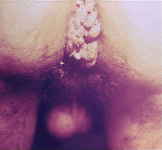 --also known as Buschke-Lowenstein tumors. These lesions are most frequently seen in persons who may be immunosuppressed. They are usually caused by HPV types 6 and 11. Patients complain about pain on defecation or bright red blood in their stools caused by trauma to the warts during defecation. Because of the bulkiness of these warts, topical treatments frequently fail to resolve the lesions and the patients may have to be referred to an anorectal surgeon for surgical removal.