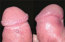 Approximately 15% of pubertal and postpubertal males have the normal finding of pink pearly penile papules.1 The practitioner usually notices these lesions on routine genital examination. Occasionally, however, a teen will notice them and mistake them for condylomata acuminata. These fleshy or whitish papules tend to be about 1 to 3 mm in diameter. They most frequently present in linear rows on the penile corona. Unlike genital warts, the pink pearly penile papules are of similar size and shape and their appearance does not change over time.