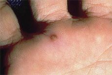 Seventeen-year-old Felicia has an appointment to see you for "the flu." She denies any upper respiratory tract symptoms but she states that all her muscles hurt and she has had temperatures up to 39.2°C (102.5°F) over the past 2 days. It especially hurts her to walk because of pain in her knees. On physical examination, you note this rash on her hands.