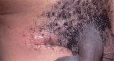 Male patients may initially recall a small, nontender herpetic-appearing lesion in the genital area that quickly self-resolves. Two to 6 weeks later, large, tender unilateral inguinal lymphadenopathy develops and further enlarges to form the buboes pictured above. Occasionally, the patient will present with a "groove sign": lymphadenopathy above and below the inguinal ligament. The buboes ulcerate and drain.
