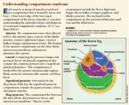 Each muscle or group of muscles is enclosed in a compartment bound by fascia and bone. The box on the left shows and describes the four major compartments of the lower extremity. In compartment syndrome, perfusion pressure falls below tissue pressure in a closed anatomic compartment, with subsequent compromise of vascular supply and tissue function. ECS results from the repetitive loading or exertional activity that an athlete experiences on a daily basis. The pathophysiology of ECS is incompletely understood, but it is generally accepted that elevated intracompartmental pressure causes ischemia of involved muscles.14 Elevated intracompartmental pressures have been found both during and after exercise in patients with ECS.15 Several studies have demonstrated a reduction in intracompartmental pressure after fasciotomy.16,17