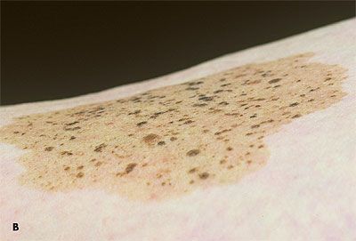 This boy’s lesion (A) is quite typical-the sort of nevus spilus pediatricians are most likely to see. The second lesion shown here (B) is a more dramatic presentation of nevus spilus in another patient.