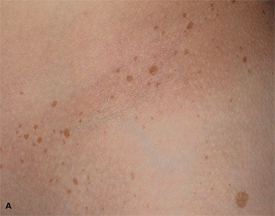 Multiple 2- to 4-mm macular and papular pigmented lesions are randomly scattered throughout. The lesions often start out with only a few speckles; more appear as the child grows. The diagnosis is almost always clinical.