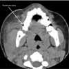 Facial CT revealed a 3-mm calcification in the distal portion of the parotid duct, diffuse enlargement of the parotid gland, and regional lymph node enlargement. After a dose of ampicillin/sulbactam, the patient was discharged with pain medication and a prescription for oral antibiotics. She was advised to apply warm compresses and to suck on sialogogues (sour candy). Follow-up with an otolaryngologist in 7 days was also recommended.