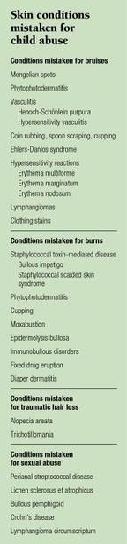 To help pediatricians distinguish between skin lesions that are causedby abuse and those that are not, we will review dermatologic conditionsand traditional ethnic medicinal practices that mimic abuse and discusstheir differential diagnoses. We separate the disorders into those thatcan be mistakenfor physical abuse, including bruises, burns, and hair loss,and those that may masquerade as sexual abuse (see table, below). In somecases, we have included vignettes from published reports or our own experienceto describe the clinical presentation and illustrate the impact that anaccusation of abuse may have on a family.