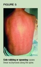 Coin rubbing, spoon scraping, cupping. Several cultural practices usedto treat illness can produce petechiae, purpura, or hyperpigmentation thatmimic physical abuse. Cao gio ("scratch the wind") is the Vietnamesepractice of rubbing the skin with a coin or spoon to alleviate "badwinds" that are presumed to cause fever.13 A medicated oilor ointment is applied to the chest and back after which a coin, spoon,or other object is scraped along the spine, neck, and intercostal spacesuntil petechiae or ecchymoses appear (Figure 5).13 A variantof spoon rubbing, called quat sha, is practiced by the Chinese.14Although many physicians are familiar with these practices, lack of awarenessby some has resulted in allegations of physical abuse.13 (See"Do traditional therapies constitute abuse?" below.)