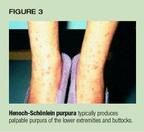Henoch-Schönlein purpura (HSP) is an idiopathic cutaneous necrotizingvenulitis that occurs primarily in children and affects the skin, synovium,gastrointestinal tract, and kidneys. Typically, skin lesions begin as erythematousmacules or papules that evolve to form so-called palpable purpura. In ambulatorypatients, the lesions are located primarily on the lower extremities andbuttocks with sparing of the trunk, palms, and soles (Figure 3). Two-thirdsof children have periarticular swelling and pain, and two-thirds have GIinvolvement--abdominal pain or vomiting.