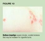 Bullous impetigo is a localized form of toxin-mediated disease. Althoughthe primary lesion is a small vesicle or bulla, these rupture rapidly leavinground erosions that become crusted. Their appearance may be confused withcigarette burns(Figure 10).17 When involvement is more extensive,lesions may mimic scald burns.