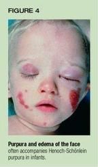 Although this constellation of symptoms and signs is generally sufficientto permit an accurate clinical diagnosis, atypical presentations have beenconfused with physical abuse.10 In particular, infants with HSPor a closely related condition called acute hemorrhagic edema of infancymay exhibit edema, erythema, or purpura of the face and ears before lesionsappear elsewhere (Figure 4).11