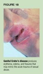 Although diarrhea and abdominal pain are the usual symptoms of Crohn'sdisease, perianal and vulvar involvement may occur and, at times, precedeintestinal manifestations. Children with vulvar Crohn's disease exhibitabscesses, induration, or edema that may be mistaken for signs of trauma.Vulvar or perianal papules can mimic lesions of condyloma acuminata, whileulcers may be misinterpreted as evidence of an ulcerative sexually transmitteddisease. In the perianal region, fissures and skin tags may be mistakenfor evidence of anal penetration. An awareness of this presentation alongwith a careful history, growth evaluation, and physical examination maysuggest the diagnosis. Biopsy is often required for confirmation.