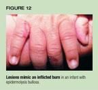 Epidermolysis bullosa (EB) is a rare disorder characterized by blisteringand erosions that may be confused with inflicted burns or poorly cared forimpetigo.27 There are at least 18 types of EB, nearly all ofwhich are inherited. In EB, gene mutations lead to synthesis of defectivestructural proteins. As a result, the epidermis is poorly anchored and patientsdevelop blisters and erosions with minimal trauma.In severe forms, erosionsoccur in the oral cavity and respiratory tract and scarring leads to pseudowebbingof the digits and esophageal stricture.