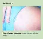 Ehlers-Danlos syndrome (EDS) is an inherited disorder with several variants,all characterized by skin laxity and hyperextensible joints. The abnormalcollagen present in patients with EDS results in vascular fragility anda tendency to develop ecchymoses following minor trauma (Figure 7). Multipleor extensive bruises in children not yet diagnosed have resulted in allegationsof physical abuse. Children with EDS also have fragile skin, which predisposesthem to lacerations from minor trauma. These children's frequent lacerationsand many scars have prompted reports of abuse.7