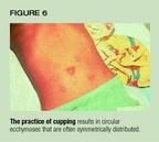 Cupping has been used for centuries to treat a variety of ailments.15In dry cupping, a heated vessel such as an eye cup or shot glass is appliedto the skin of the affected area to "elevate the congestion."The vacuum formed during this maneuver creates suction on the skin thatresults in a circular ecchymosis (Figure 6). Wet cupping is a similar procedurein which the vessel is applied to previously abraded skin.15