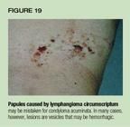 As discussed previously, lymphangiomas are benign malformations of lymphchannels that may be manifest clinically as cystic or vesicular lesions.Lymphangioma circumscriptum is a form of this disorder characterized byvesicles that may be hemorrhagic (Figure 19). Typically, lesions are presentat birth or appear in early childhood. Vesicles may increase in number overtime, however. The condition persists and the only effective therapy isexcision.