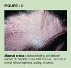 Alopecia areata is an autoimmune condition characterized by well-definedpatches of complete or near total hair loss (Figure 13). The scalp is normalwithout erythema, scaling, or edema.