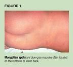 Mongolian spots are blue-gray macules or patches that are usually locatedover the lumbosacral area, although they may appear on the back, shoulders,or extremities (Figure 1). The spots, which result from the deposition ofmelanin in the dermis, are present at birth and tend to fade over severalyears. They are particularly common in African-Americans, Asians, and Hispanicsbut may also occur in white infants.