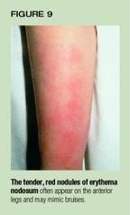 Erythema nodosum appears as tender, red nodules that typically are locatedon the extensor surfaces of the lower extremities, although the face, solesof the feet, and trunk may be involved (Figure 9). Given the appearanceof the lesions, it is not surprising that this condition has been confusedwith physical abuse.17 Erythema nodosum reflects injury to bloodvessels in the lower dermis and subcutaneous fat that probably results froman immunological response to an infectious agent.