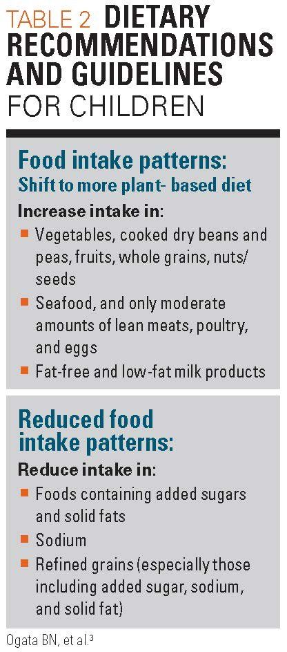 Guidelines on what constitutes good nutrition for children and adolescents, as well as adults, are well established. Among these are 2 guidelines published in 2015, one for all Americans (adults and children)-Dietary Guidelines for Americans 2015-2020, 8th edition,2 published by the US Department of Health and Human Services and US Department of Agriculture-and one published by the Academy of Nutrition and Dietetics specifically for children aged 2 to 11 years-Nutrition Guidance for Healthy Children Ages 2 to 11 Years.3 As shown in Tables 1 and 2, the foundation of both guidelines is a shift to more plant-based foods (vegetables, fruits, lean protein) and a reduction in saturated fats, sodium, and sugars.