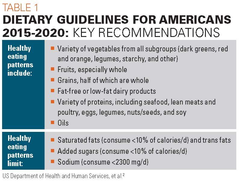 2. US Department of Health and Human Services; US Department of Agriculture. Dietary Guidelines for Americans 2015–2020. 8th ed. Available at: https://health.gov/dietaryguidelines/2015/resources/2015-2020_Dietary_Guidelines.pdf. Published December 2015. Accessed November 25, 2019.