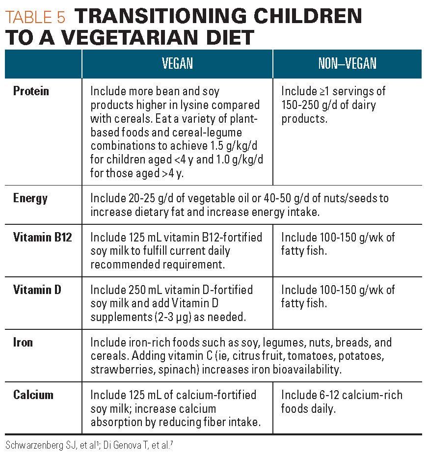 Table 5 provides some guidance on how to prevent micronutrient deficiencies in children who transition to a vegetarian diet.1,7