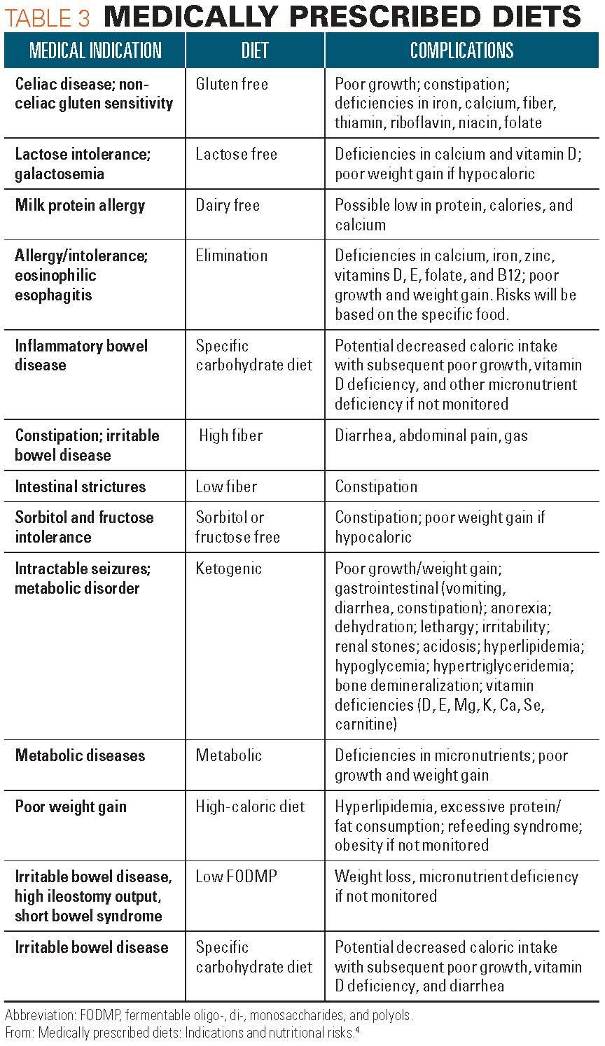 For some children, however, medical conditions may mandate altering the diet to manage the condition. Examples include children with celiac disease for whom gluten is restricted; children with food allergies in whom specific foods related to the allergy are eliminated; overweight and obese children in whom overall caloric intake is reduced; and those with diabetes who need to avoid foods high in simple sugar. Table 3 lists a range of medically prescribed diets.4 Other conditions for which parents may place their children on a restricted diet, less supported by evidence but growing in popularity, may include attention-deficit/hyperactivity disorder (ADHD), non-celiac gluten sensitivity, and autism spectrum disorder.5-6