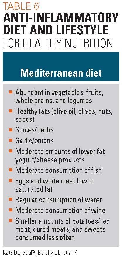Much of the evidence to date on benefits of the anti-inflammatory diet come from studies on the Mediterranean diet, including a 2019 meta-analysis of over 2 million people showing a reduction in mortality (8% from any cause and 10% from cardiovascular or cerebrovascular disease) and 13% reduction in neurodegenerative diseases associated with a 2-point increase of adherence to the Mediterranean diet.14 Other benefits shown in children include a reduction in the severity of asthma and allergies as well as reduced recurrence of asthma and prevention of chronic asthma.13