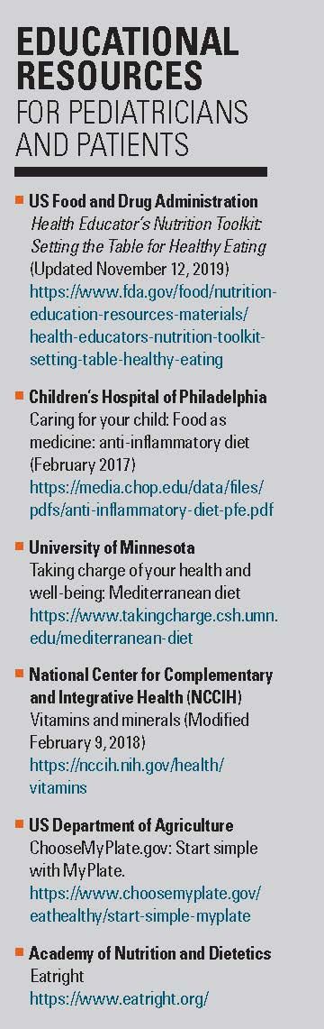 13. Barsky DL. The anti-inflammatory diet’s surprising benefits in children. Medscape. Available at: https://www.medscape.com/viewarticle/894241#vp_2. Published April 3, 2018. Accessed November 25, 2019.