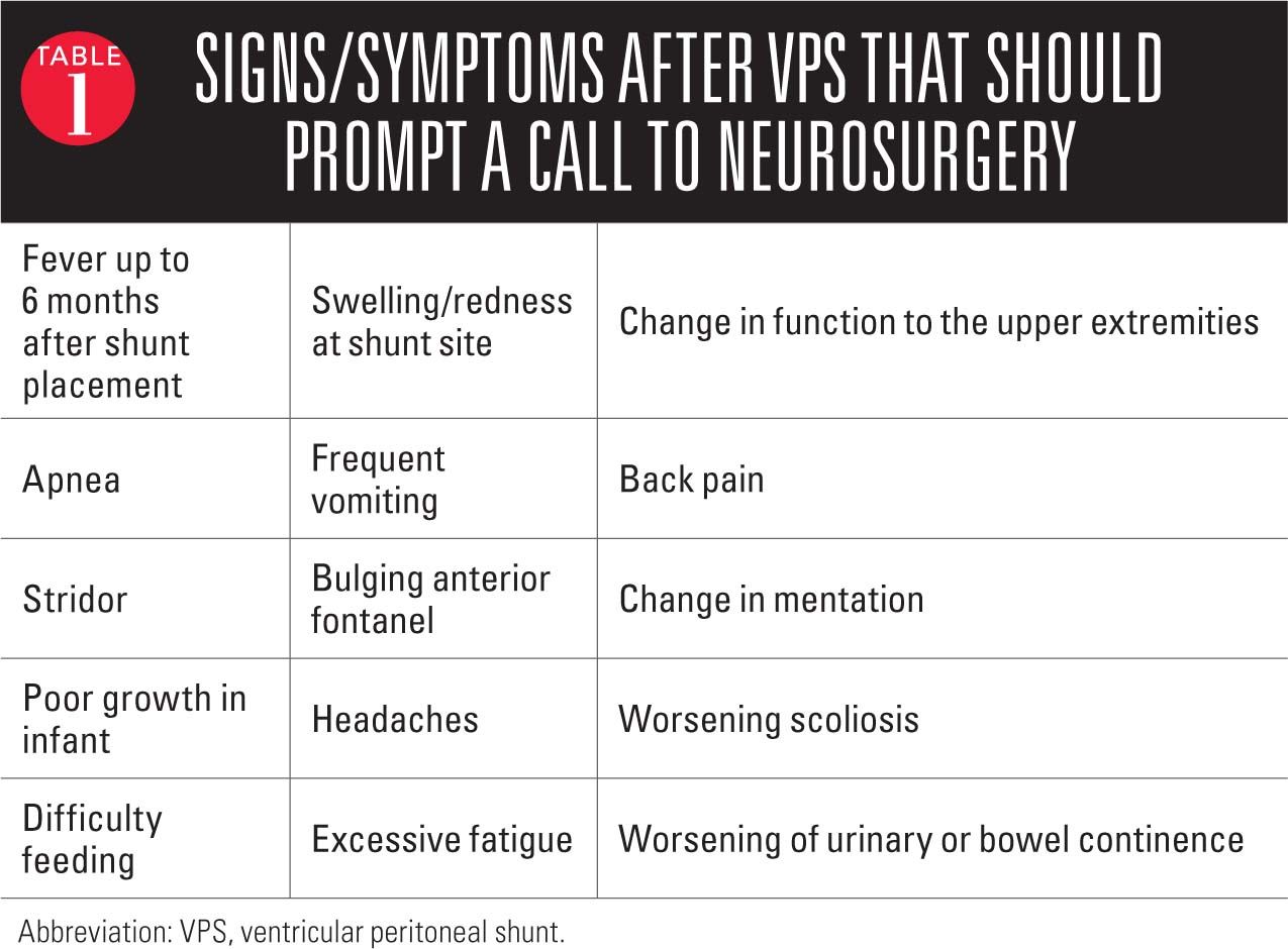 In the younger child irritability, esotropia, or fatigue may indicate a malfunctioning shunt whereas in the older verbal child headache or vomiting may be the obvious signs of shunt malfunction (Table 1).13 More subtle signs such as changes in school performance and cognitive abilities, excess fatigue, trouble writing, or trouble ambulating can be hints to a malfunctioning shunt. Frustratingly, at times shunt malfunction can present with or without obvious signs of increased intracranial pressure. Neurosurgery should be contacted and the patient sent to the local emergency department if there is concern about a shunt malfunction.