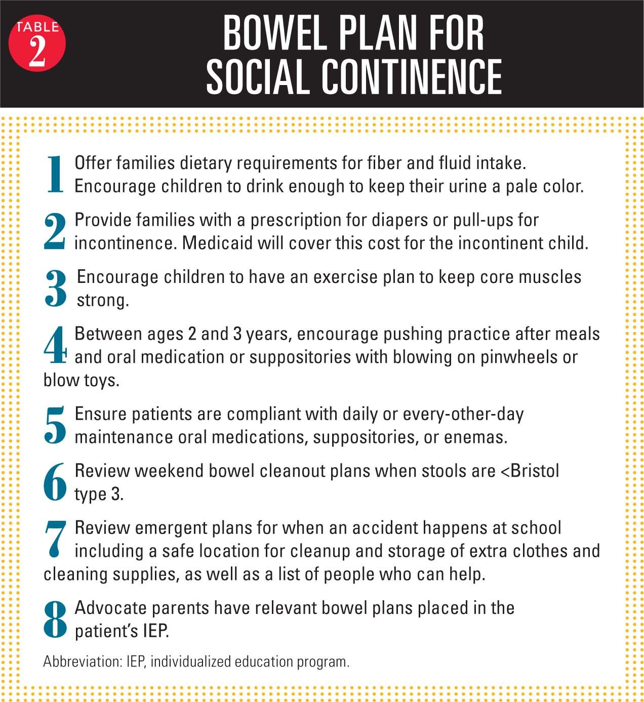 One hopes to offer the family a time-efficient and flexible plan to eliminate stool that will allow the child to manage independently at some point. The hope is that children will learn to manage well enough to avoid the social isolation that correlates strongly with incontinence.24 Parents will also need to understand that bowel continence is altered by many different factors and children will have better weeks and worse weeks. It will be critically important for parents to be able to recognize clues that will let them know when to alter medication dosages from the agreed-on bowel plan. Patients, parents, and PCPs should have a copy of the Bristol stool chart (available online at http://bowelcontrol.nih.gov/Bristol_Stool_Form_Scale_508.pdf) to make an often-nebulous stool description more empiric.25 The urologist, pediatric gastroenterologist, or a general pediatrician associated with the spina bifida clinic can help offer advice on the bowel plan.