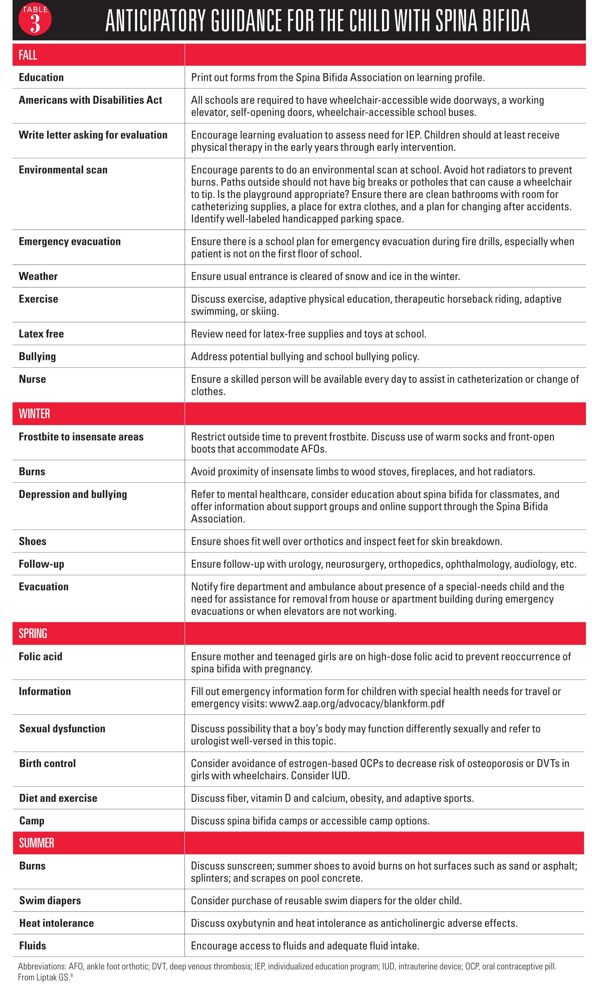 Offering advice to typical patients is a routine part of practice, but offering advice to these children requires some thought as to their needs and what is relevant. An appropriate anticipatory guidance list divided per season is listed in Table 3.8 Again, patients should be also referred to the Spina Bifida Association website.