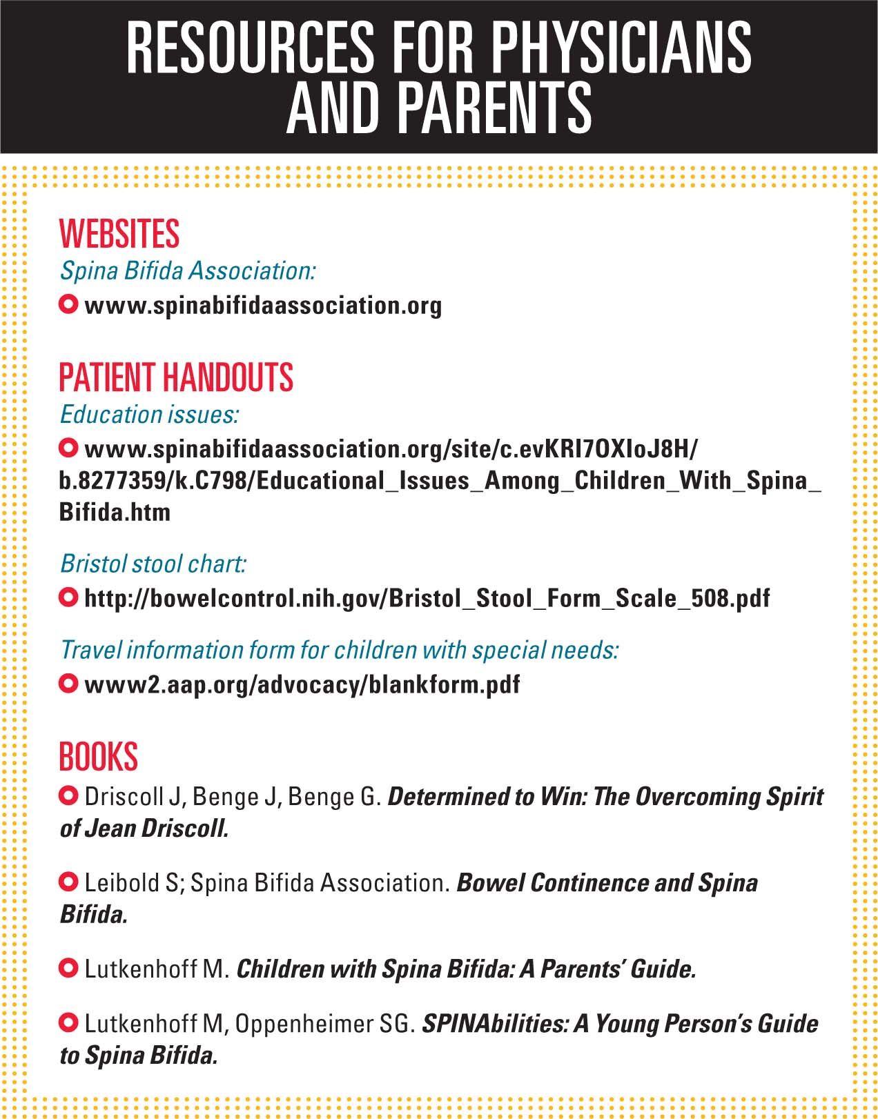 8. Liptak GS. Spina bifida. In: Osborn LM, DeWitt TG, First LR, Zenel JA, eds. Pediatrics. 1st ed. Philadelphia, PA: Elsevier Mosby; 2005:1168-1174.