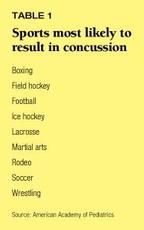 Head trauma is common in sports. Each year, sports participants in the United States experience an estimated 300,000 mild to moderate head injuries that could be classified as concussions.1 The occasional death of an athlete who has returned to play after a mild head injury and receives a second injury, the so-called second-impact syndrome, highlights the need for information on when it is safe to return to practice and games after a concussion. Physicians whose patients are athletes, especially youngsters who participate in contact sports (Table 1), also are concerned about the possibility of permanent brain damage from the cumulative effects of multiple concussions.2 Young players, influenced by reports about "macho" professional athletes who return to play before their doctors advise them to, need to be helped to understand that they are more vulnerable to serious brain injury than their older, professional counterparts.