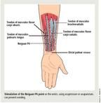 Acupressure and acupuncture are the best-studied nonpharmaceutical interventions for both adults and, by extrapolation, for children. Classically, stimulation of the Neiguan (P6) meridian point on the wrists produces antiemetic effects in patients who are awake. In adults, this point is approximately 3 cm from the distal palmar crease between the palmaris longus and flexor carpi radialis tendons (see figure). Many studies in adults have shown positive effects of acupressure or acupuncture antiemetic prophylaxis in perioperative settings.17,18 Two studies of Neiguan wrist massage of P6 using wrist bands showed mixed results.19,20 A single study demonstrated the effectiveness of a portable acustimulation device in controlling seasickness.21