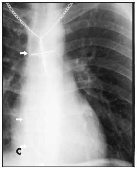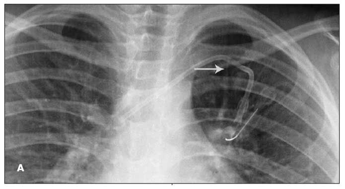 Figure A is from an 8-year-old boy with acute lymphoblastic leukemia. Fluoroscopy confirmed the catheter tip to be at the junction of the superior vena cava and right atrium with no kinks. At about month 19, during an attempt to access the CVC, the patient had pain in his left shoulder. A chest radiograph revealed a fractured piece of the CVC tubing overlying the left lung in the aortopulmonary window region. The distal fragment was lodged in the left main pulmonary artery. The patient could not recall, nor did he complain of, any traumatic events or symptoms that could be attributed to the fracture. On review of previous chest films, an intermittent focal narrowing of the catheter tubing-“pinch-off sign” (POS)-was found. The catheter fracture site (Figure A, arrow) corresponded with the area where the POS was noted.