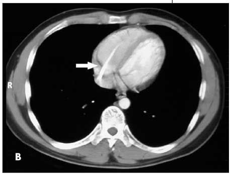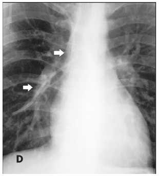 Figures B, C, and D are from a 17-year-old boy with Ewing sarcoma of the left hemipelvis. Fluoroscopy was used to confirm catheter placement, and blood return and ease of flushing the catheter were verified. During a routine clinic visit 18 months later, the patient complained of a cough and “feeling funny.” A chest radiograph was read as normal. A CT scan of the chest, obtained for routine evaluation of possible metastasis, was also interpreted as normal. However, embedded in the radiologist’s report was the comment, “A unipolar transvenous pacemaker has been placed with its tip in the right ventricular apex.” What the radiologist noticed was actually a fractured piece of CVC tubing (Figure B, arrow). Careful inspection of the patient’s earlier “normal” chest radiograph showed the fractured piece of tubing within the right atrium and ventricle (Figure C, arrow). A second chest radiograph showed the tubing fragment lodged in the right pulmonary artery extending into the right lung (Figure D, arrows). No POS was seen in a review of the patient’s radiographic records.