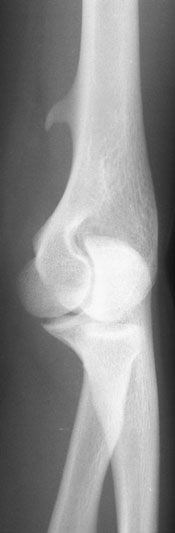 An otherwise healthy 16-year-old girl presented with medial arm pain after falling on her left elbow while skating. Robert P. Blereau, MD, and Timothy J. Haley, MD, of Morgan City, La, write that a radiograph of the left upper arm showed a spur projecting from the distal humerus; there was no fracture or dislocation.