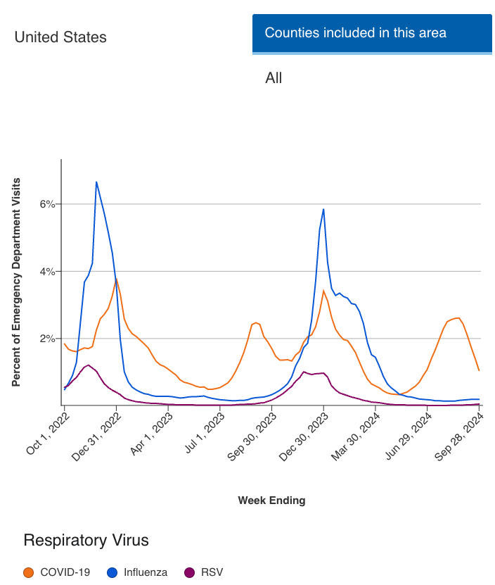 For the week ending of September 28, 2024, 0.1% of emergency department visits in the United States have been the result of RSV infection.4