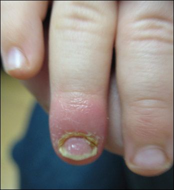 Inflammation of the skin surrounding the nail can be either acute or chronic. Acute paronychia is most commonly caused by Staphylococcus aureus and manifests clinically as painful erythema, at times accompanied by purulent discharge. Topical antibacterial ointments (eg, mupirocin) are generally sufficient for treatment.