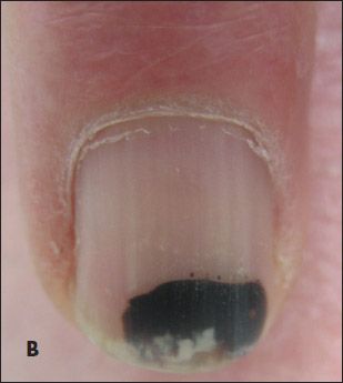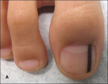 Trauma is another cause of subungual pigmentary change, but this can usually be easily diagnosed from a history of trauma to the affected area. Also, the pigment is generally confined to the area of trauma (B) rather than having a linear configuration, and it grows out with the nail over several weeks to months.