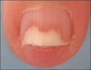 The oral antifungal of choice is terbinafine, which is given for 6 weeks for onychomycosis involving the fingernails and for 12 weeks for infections involving the toenails. Liver function should be assessed at baseline and after 6 weeks of treatment. Improvement is defined as normal-appearing nail proximally, as in the photograph above.