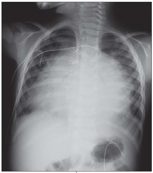Alert, playful, and afebrile child. Heart rate, 103 beats per minute; blood pressure, 88/61 mm Hg; and respiration rate, 28 breaths per minute, with oxygen saturation, 98% on room air. He had notable intercostal retractions and grunting. Cardiovascular examination revealed normal rhythm, with distant heart sounds. Pulses were 2+, capillary refill was less than 2 seconds. He had mild abdominal distention, with a palpable liver edge at 3 to 4 cm. Physical findings otherwise normal.