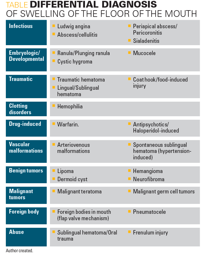Based on the above results, the possible differential diagnoses of oral cavity swellings in the floor of the mouth are numerous (Table):